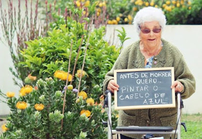 Há pedidos tão simples, como pintar o cabelo de azul, andar de bicicleta, dar um grande beijo na boca, há pedidos que parecem mais difíceis de realizar como voar, mas que a boa vontade faz elevar nesta vontade de fazer acontecer, há outros que me chocam mais pela sua simplicidade, mas pela mensagem de abandono que está subjacente, e que me faz pensar na sorte que tenho de puder viver de perto a idade que vai avançando naqueles que me são mais queridos, e por isso eu sei que a minha avó fica imensamente feliz quando vê os netos e que adora partilhar uma refeição connosco, e mesmo às vezes quando "perco a paciência" e lhe digo para falar como gente grande, em boa verdade, tudo não passa de um mimo, reflexo do amor imenso que lhe tenho.